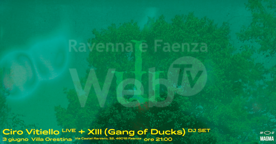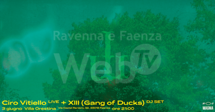 Si parte il 3 giugno alla Villa Orestina di Faenza, con un live elettronico sperimentale di Ciro Vitiello, alter-ego dell’electronic artist Giuseppe Federico Pastore. Le sue composizioni, influenzate dalla cultura ambient/noise, ultimamente prendono ispirazione dall’evoluzione della tecnologia e dall’influenza che essa ha sull’essere umano. A seguire, è previsto un djset di XIII, alter-ego di Alessio Capovilla, con cui il compositore esamina principalmente la parte più tattile e digitale del suo sound che incrocia ritmi e generi verso qualcosa di non facilmente definibile.