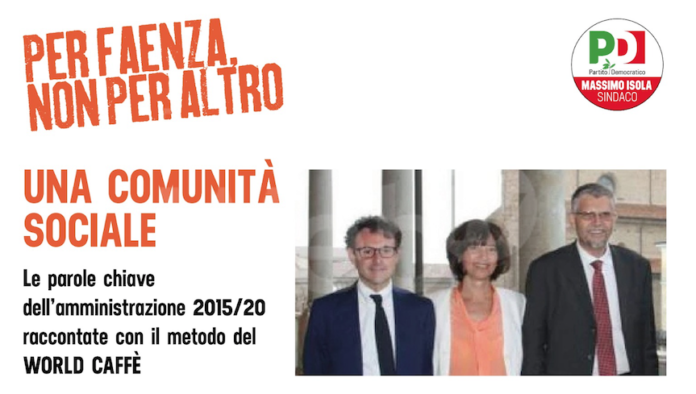 “Martedì 15 settembre alle ore 17.30 al Centro Commerciale La Filanda, con l’attuale assessore al welfare Claudia Gatta, e il sindaco Giovanni Malpezzi ripercorreremo insieme, utilizzando il metodo del world caffè, le parole chiave dell’amministrazione comunale uscente. Interverrà anche il candidato sindaco del Centro Sinistra Massimo Isola proponendoci alcuni stimoli e idee sulle prospettive sociali e sanitarie che è lecito attendersi nei prossimi anni”.