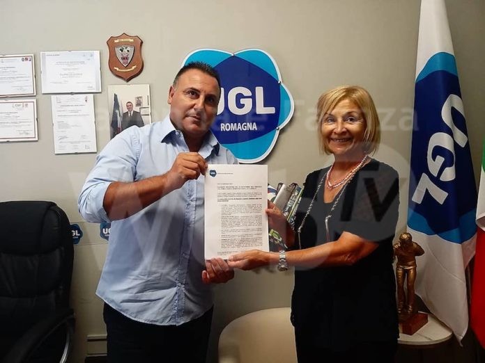 La firma del documento nella sede forlivese del sindacato alla presenza del segretario dell’Ugl di Forlì-Cesena, Rimini e Ravenna, Filippo Lo Giudice.