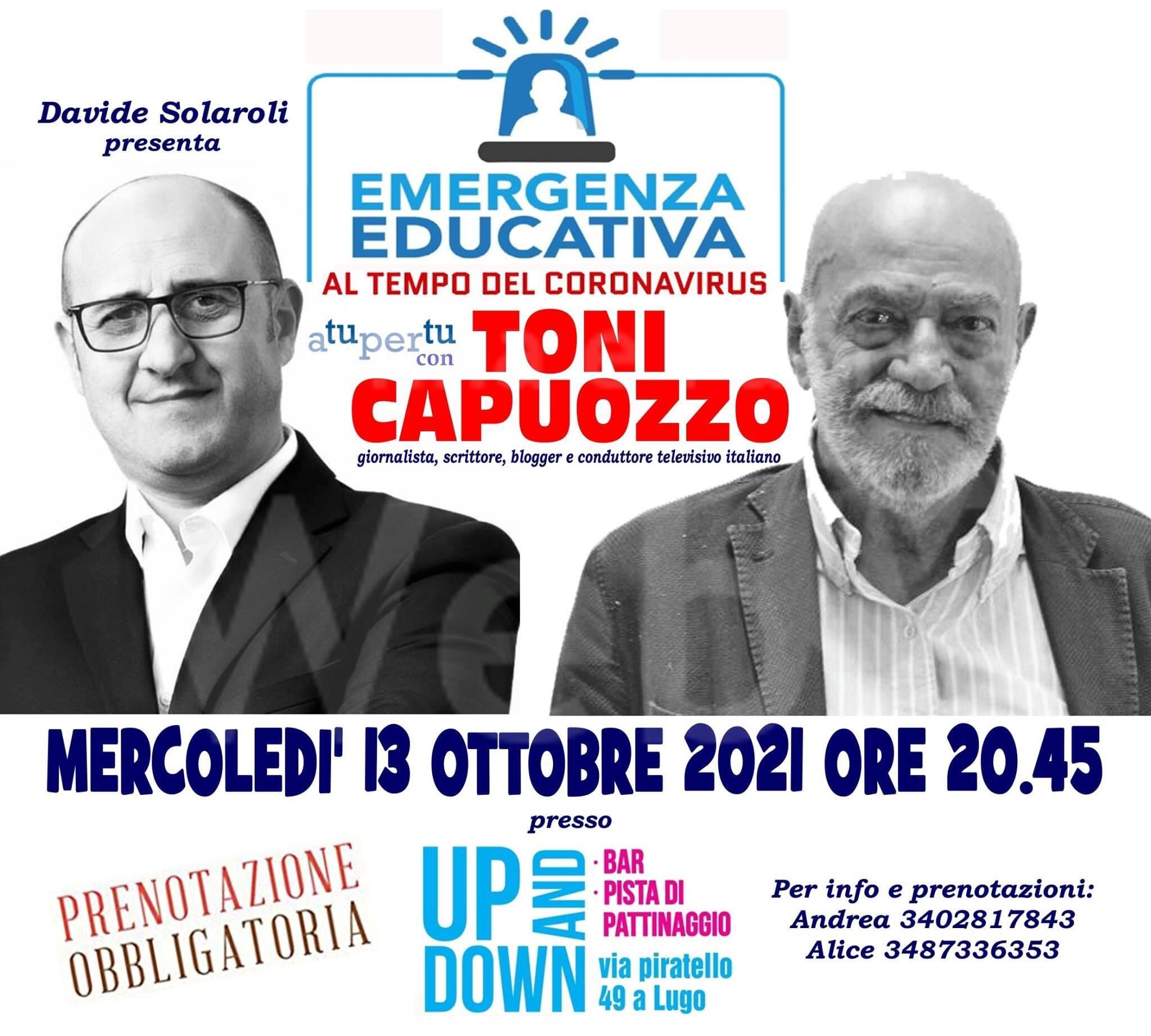 Mercoledì 13 ottobre alle ore 20.45 alla Pista di Pattinaggio di Via Piratello 49 a Lugo si terrà il primo appuntamento del ciclo di incontri pubblici intitolati “Emergenza educativa al tempo del coronavirus” ed organizzati da Davide Solaroli, insegnante, Presidente dell’Associazione M.I.E.L.E. e Consigliere comunale lughese. L’ospite illustre di questa prima serata sarà il giornalista, scrittore, blogger e conduttore televisivo Toni Capuozzo con il quale, partendo dall’analisi del suo libro “Lettere da un Paese chiuso”, una sorta di “diario di bordo” fatto di pagine sulla cronaca, sulla politica, sull’isolamento forzato, su uomini e donne alle prese con la vita e con la morte durante le lunghe settimane della quarantena da coronavirus, si dialogherà di disagio giovanile, di come il periodo di lockdown lo abbia accentuato e della necessità che tutta una comunità si senta chiamata a trasformarsi in comunità educativa ed educante.
