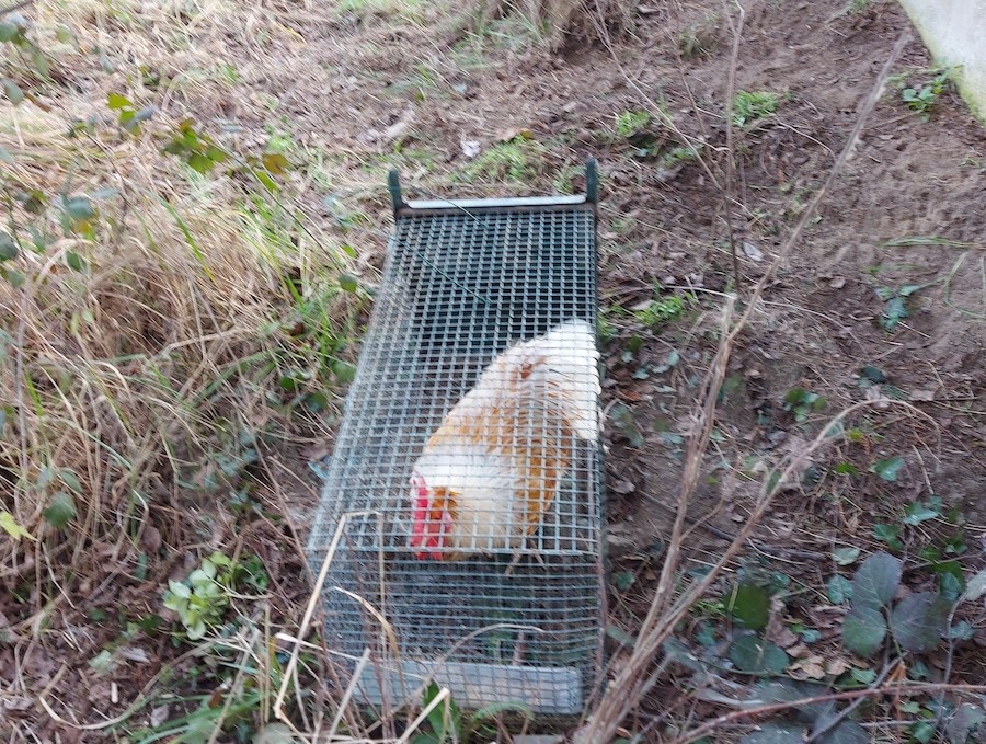 Di fronte a questa situazione si sono attivati alcuni nostri volontari i quali prima mediante l’uso di reti hanno fatto i primi tentativi di cattura ma dopo non pochi giorni non essendosi ottenuto alcun risultato hanno posizionata una gabbia da cattura, particolarmente sensibile, la quale ha consentito di raggiungere lo scopo. Ecco quindi che attratti dal cibo contenuto in una ciotola all’interno della gabbia si è riusciti a catturare il primo gallo.