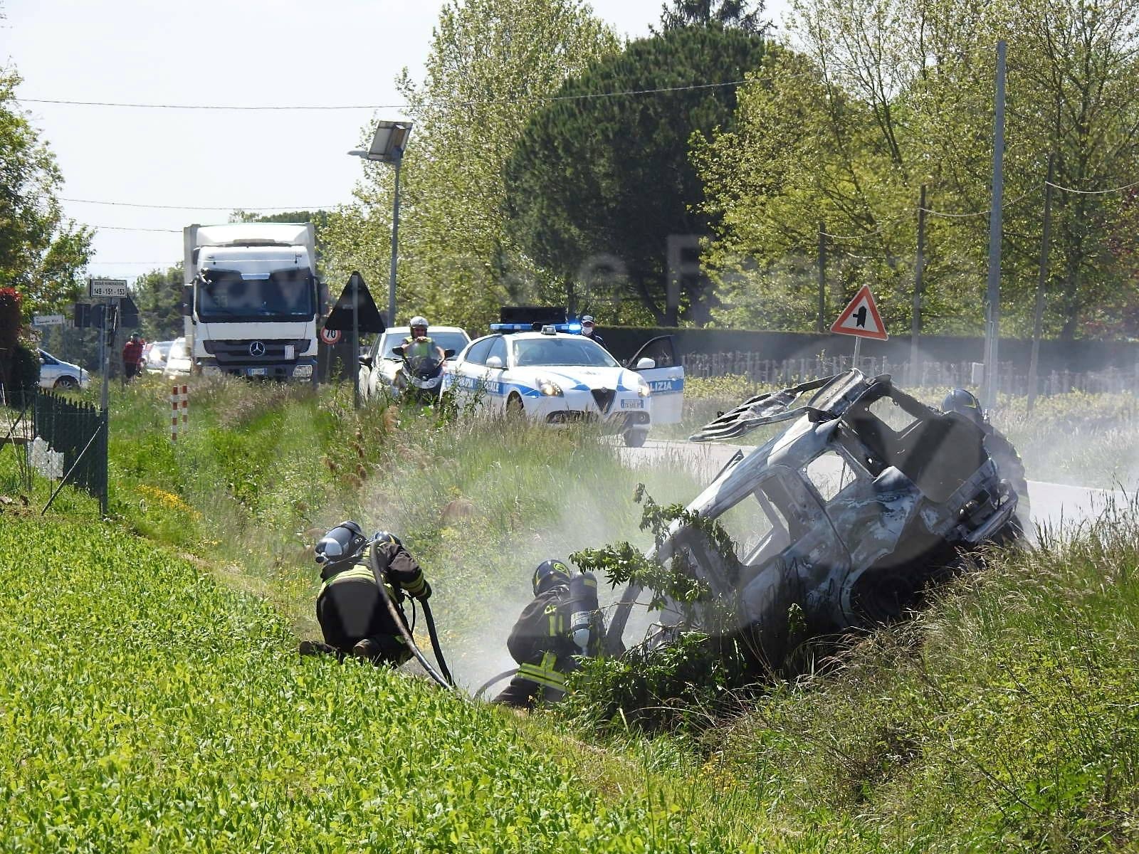 Incendiata auto oggi alle 13.20 ad Alfonsine sulla via Stroppata, poco fuori dal paese direzione Fusignano, illesi i due occupanti. L’auto alimentata a Gpl è uscita di strada in un fosso poco profondo, a seguito dell’impatto, ha preso fuoco. Sul posto si sono portati i Vigili del Fuoco, la Polizia Locale della BassaRomagna ha chiuso la via Stroppata durante le operazioni di spegnimento. L’auto è andata completamente distrutta.