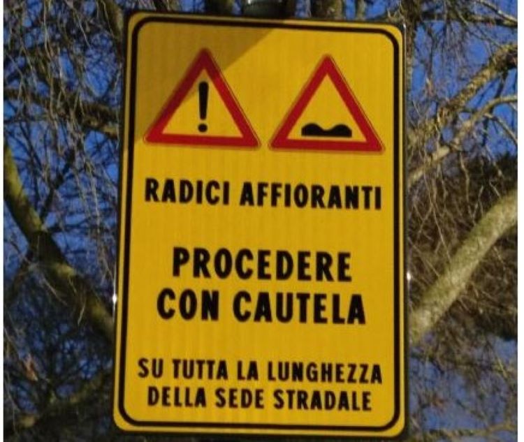 “Chi abbia la ventura di transitare in via Bidente noterà un nuovo e singolare cartello stradale : RADICI AFFIORANTI.