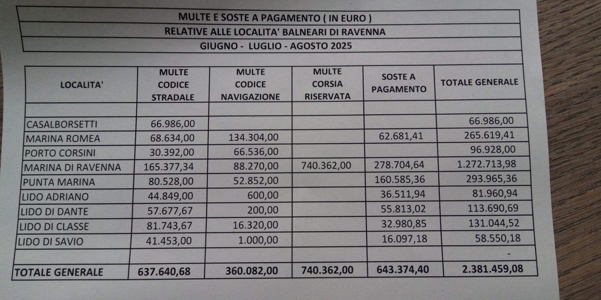 2 milioni 381 mila euro incassati dalle multe nei lidi ravennati nei mesi di giugno, luglio e agosto. Il dato è stato illustrato da Lista per Ravenna. Prima, nella poco felice classifica, è Marina di Ravenna, con quasi 1 milione e 273 mila euro in sanzioni, la maggior parte derivanti dalla corsia preferenziale voluta per gli autobus, lungo la quale sono state elevate multe per 740 mila euro. Al secondo posto Punta Marina, al terzo Marina Romea, prima però, con oltre 134 mila euro, nelle multe per sosta vietata nelle aree e negli stradelli prossimi alla spiaggia, somma che non entra a far parte del bilancio comunale, poiché sotto giurisdizione del Codice della Navigazione. Seguono poi Lido di Classe, Lido di Dante, Porto Corsini e infine Lido Adriano, il lido ravennate più esteso (Casal Borsetti fa registrare multe unicamente per infrazioni al codice della strada). Di fronte quindi a quello che viene giudicato come un fattore utilizzato dai turisti per scegliere una località balneare, Lista per Ravenna chiede un confronto con l’amministrazione comunale per impostare la nuova stagione turistica e per utilizzare questi proventi a favore dei lidi.