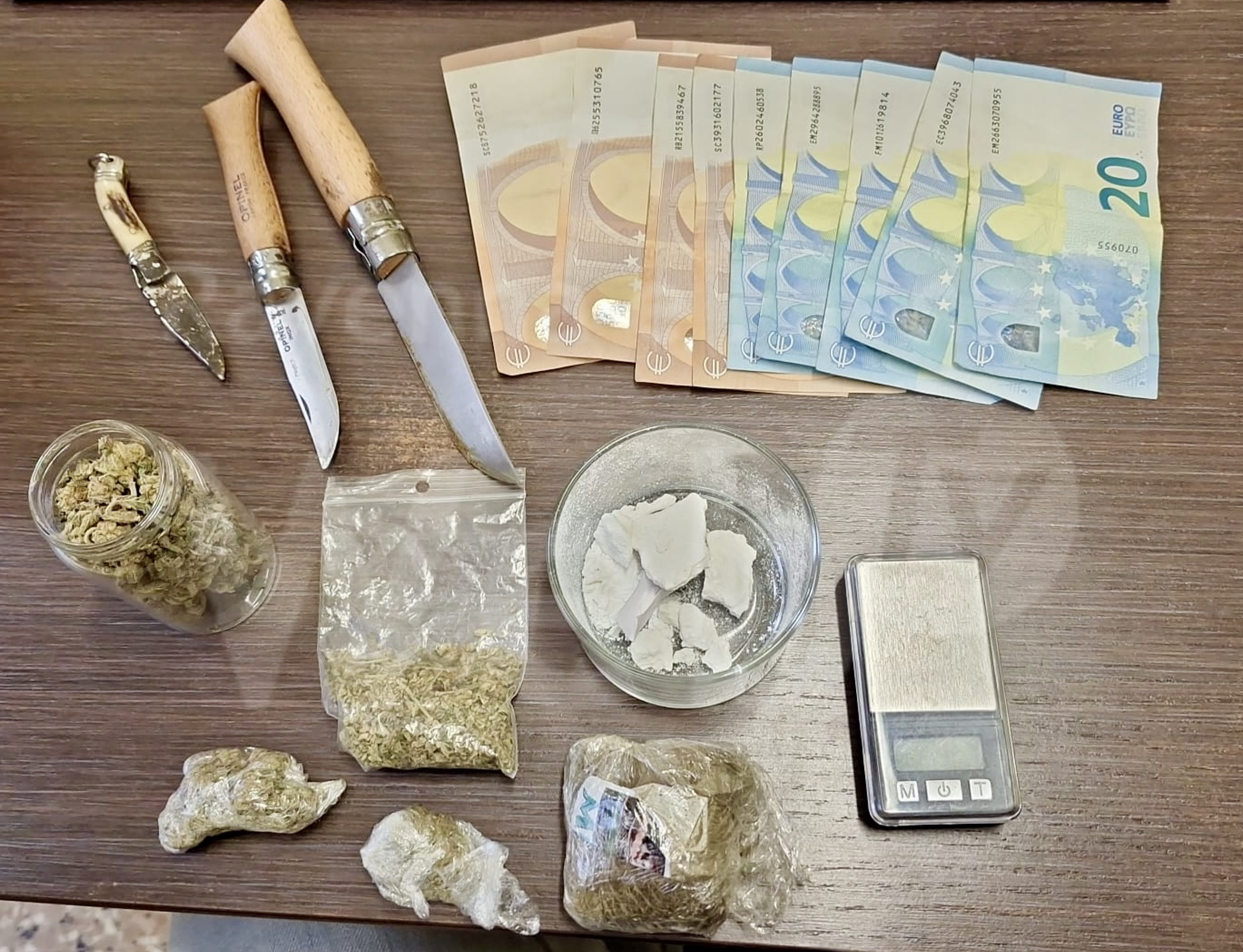 L’attività ha avuto termine questa mattina, dopo aver eseguito una perquisizione domiciliare presso la sua abitazione, dove rinvenivano e sequestravano circa gr. 100 di sostanza stupefacente tra cocaina, hashish e marijuana, un bilancino di precisione, 3 coltelli e materiale per il confezionamento, oltre la somma di € 300, ritenuta provento di attività di spaccio di stupefacente.