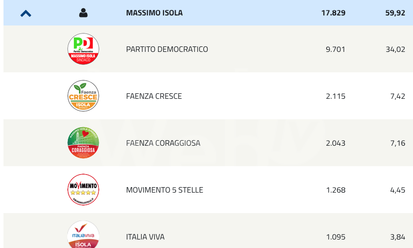 Faenza Cresce è una delle sorprese di questa tornata elettorale. La lista nata per sotenere Massimo Isola, con una forte matrice cattolica, ha collezionato 2.185 voti diventando la seconda forza all’interno della maggioranza. In termini percentuali Faenza Cresce è invece oggi la terza forza politica della città, al pari di Fratelli d’Italia. Fra le due liste il divario è solo di 15 voti, lo 0,05%. Con il risultato raggiunto, quindi Faenza Cresce entra in consiglio comunale con due consiglieri e molto probabilmente avrà la possibilità di esprimere almeno 1 assessore. 1 consigliere invece per Italia Via, con 1.139 voti. Il partito renziano ha visto probabilmente sfuggire diverse preferenze a favore proprio di Faenza Cresce, ma il suo capolista, Alessio Grillini, è comunque riuscito a centrare l’obiettivo minimo di questa campagna elettorale: tornare in consiglio comunale. Un po’ sottotono gli altri rappresentanti di lista, che hanno pagato l’inesperienza politica.