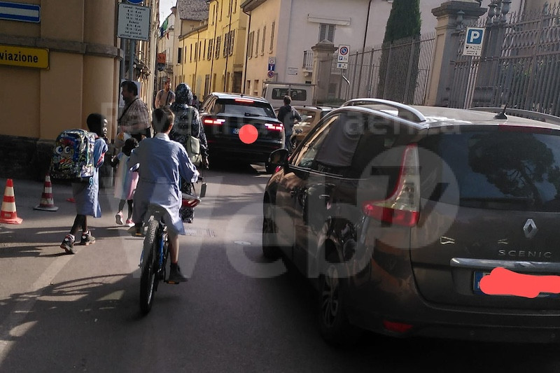 I bambini rischiano quotidianamente di essere messi sotto o “sportellati”, stretti tra auto posteggiate e in retromarcia, mentre tentano in bici di raggiungere il portone della scuola.