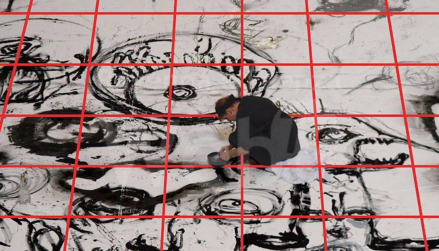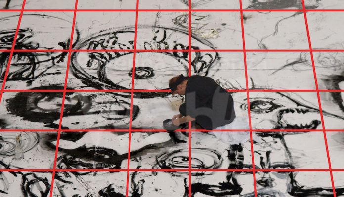 “Tempo bianco” è un’opera realizzata da ?collettivo, una sinergia artistica nata nel 2018 dalle esperienze comuni di Filippo Zoli, Fabrizio Fortini e Dania Zanotto. Lo sconcertante fondale teatrale ha messo in scena un moderno ed inquietante inferno dantesco ispirato ad alcune incisioni presenti nell’edizione della Divina Commedia edita a Venezia nel 1596 conservata alla Biblioteca Diocesana card. Cicognani ed esposta in occasione della mostra: i gironi infernali delle incisioni cinquecentesche, con le loro linee marcate e asciutte, sono stati dunque riletti in chiave contemporanea per diventare occhi e volti, bocche mostruose, orrifiche visioni. L’enorme tela, realizzata all’interno di una performance di dieci ore nelle quali pittura e danza si sono intrecciate, sarà calata come una grande scenografia una volta terminato lo spettacolo e sarà divisa, un frazionamento che da un lato segnerà la fine dell’opera così come è stata vista fino ad ora e al tempo stesso ne decreterà un nuovo inizio. I numerosi frammenti saranno infatti intelaiati per divenire nuovi quadri di inedito fascino.