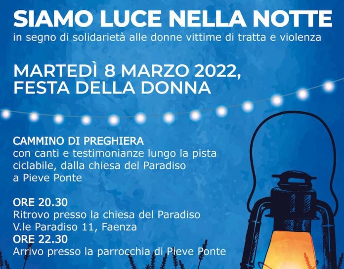 La camminata, che prenderà il via alle ore 20.30 presso la Chiesa del Paradiso e terminerà a Pieve Ponte, snodandosi lungo la ciclabile, è dedicata alle donne vittime di violenza e tratta e sarà arricchita da testimonianze, canti e momenti di riflessione e preghiera.