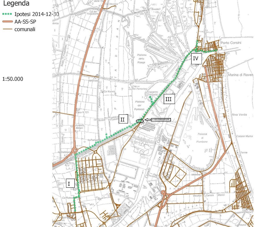 FIAB Ravenna auspica infine che a completamento del tratto in fase di realizzazione, si proceda in tempi brevi anche alla realizzazione dei ponti ciclopedonali, di attraversamento del canale della Baiona e del canale di alimentazione della centrale ENEL “Teodora” purtroppo non previsti dal progetto appaltato.Nella mappa sono indicati i tratti del progetto FIAB Ravenna, di cui sono oggetto dell’appalto i trattiII, III e IV.