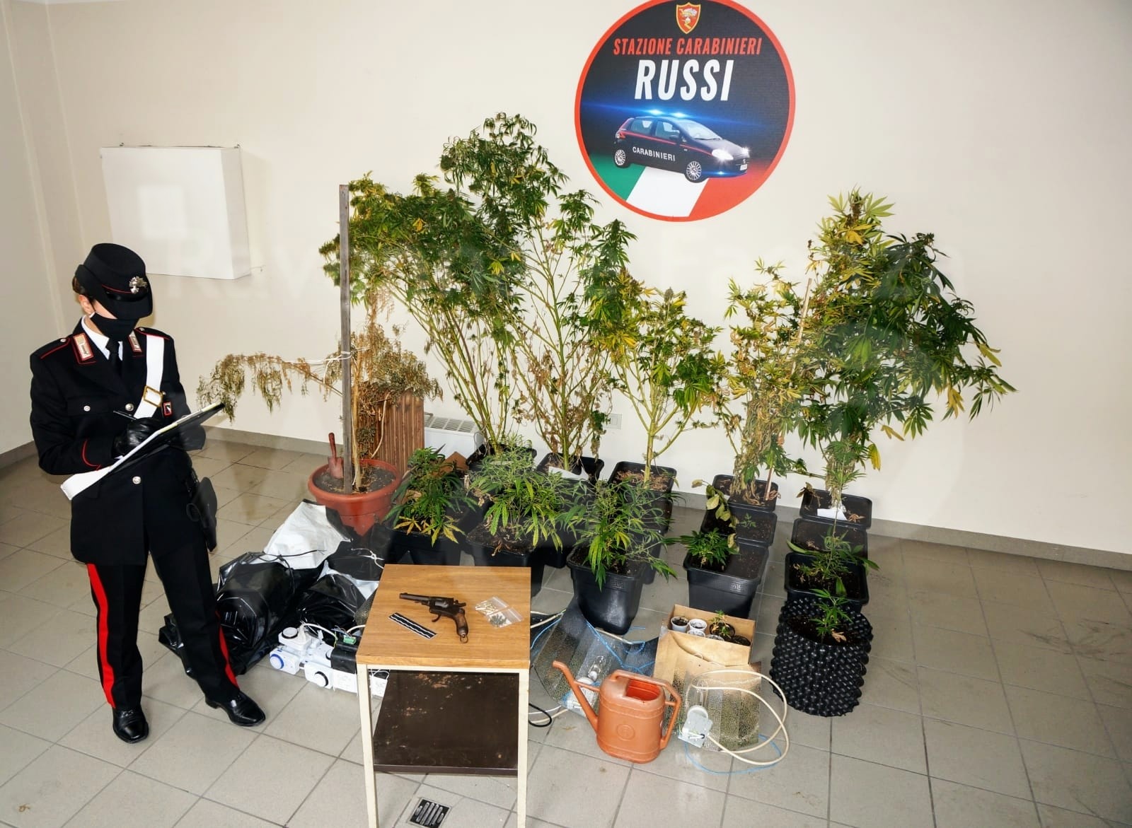 In particolare, i suddetti militari, durante una perquisizione domiciliare delegata presso l’abitazione dell’italiano alla ricerca di fonti di prova attinenti al reato di usura, hanno rivenuto una pistola da guerra e vario munizionamento abusivamente detenuti dal predetto. L’attività, estesa alle pertinenze della dimora, ha consentito di rinvenire, in un attiguo capannone in uso ai 4 magrebini (un 52enne, un 31enne, un 26enne ed un 21enne) una serra artigianale con all’interno 17 piante di marijuana, pronte per la raccolta, nonché 20 grammi di hashish e 50 di marijuana preparati per il consumo, oltre a vario materiale per la coltivazione e il confezionamento dello stupefacente.