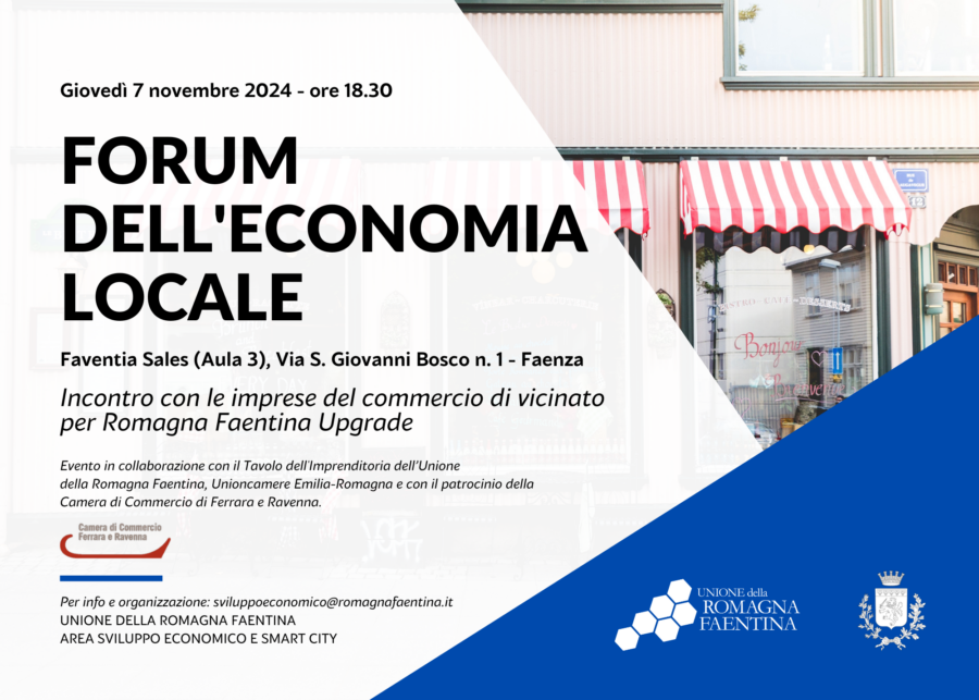 Si terrà giovedì 7 novembre alle ore 18.30 il quinto appuntamento del Forum dell’Economia Locale, un’occasione di confronto con le imprese del commercio di vicinato. L’incontro avrà luogo presso Faventia Sales (Aula 3) in Via S. Giovanni Bosco n. 1, Faenza.
