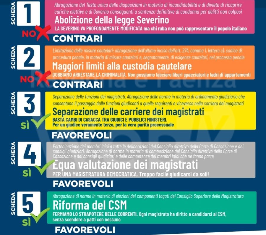 “Nella giornata di domani giovedì 9 giugno alle ore 20.30 presso la sala conferenze della seconda circoscrizione in via Berlinguer 11, Fratelli d’Italia organizza una iniziativa pubblica in cui si illustreranno i quesiti del referendum a cui saremo chiamati a votare domenica 12 giugno. Introdurranno la serata i consiglieri comunali Alberto Ferrero e Renato Esposito ed interverranno gli avvocati Patrizia Zaffagnini ed Enrico Mezzanotte. Seguirà dibattito.”