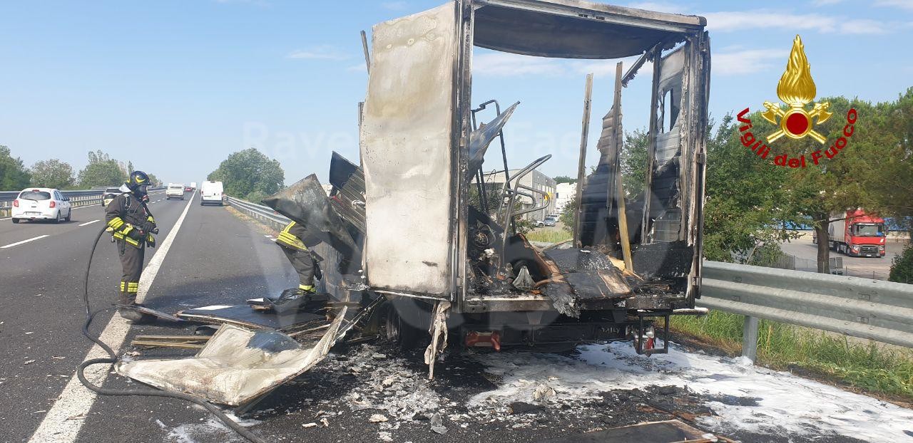 Le operazioni di spegnimento hanno comportato il momentaneo blocco del traffico, le fiamme hanno completamente distrutto il mezzo ed il carico trasportato al momento. Sul posto anche la Polizia Stradale di Faenza.