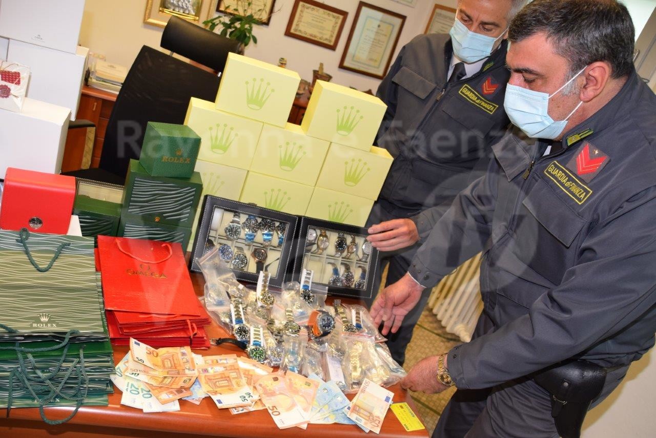 I Militari del Comando Provinciale Guardia di Finanza di Ravenna, all’esito di una complessa indagine di polizia giudiziaria, hanno denunciato all’Autorità Giudiziaria 3 soggetti, residenti nella provincia ravennate, e sottoposto a sequestro 220 orologi e 1.300 articoli tra confezioni e certificati di garanzia recanti i marchi falsi dei noti brand ROLEX® e OMEGA®, nonché una somma di denaro contante di € 965,00 e alcune carte poste pay utilizzate per il commercio illegale.