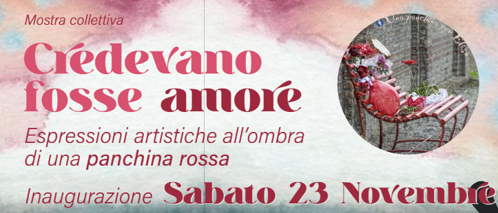 Il gruppo Una panchina per Elisa, in occasione del 25 novembre, giornata internazionale contro la violenza sulle donne, ha allestito nella saletta di vicolo degli Ariani 4/a, la mostra di pittura “Credevano fosse amore. Espressioni artistiche all’ombra di una panchina rossa”. La mostra, in collaborazione con il Comune di Ravenna, inaugurerà sabato 23 novembre alle 16 e sarà visitabile fino al 5 dicembre. L’ingresso è gratuito.