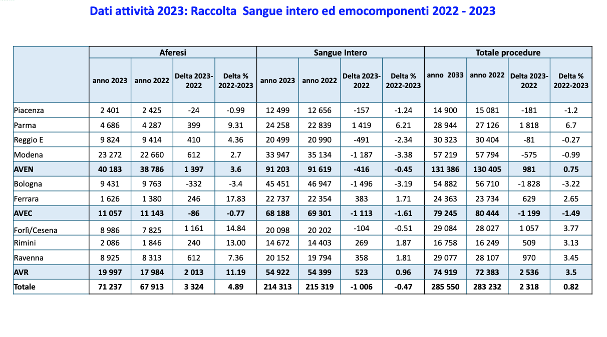 Nel 2023 le unità di sangue intero donate sono state 214.313, contro le 215.319 dell’anno precedente (-0,47%). Non si tratta di un dato negativo, ma del risultato frutto della programmazione regionale, cioè di una raccolta in funzione dei fabbisogni anche grazie al contributo delle associazioni/federazioni dei donatori.