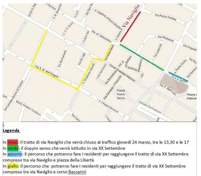 Invece, per i veicoli, con portata non superiore ai 35 quintali, diretti in via Ugolino d’Azzo Ubaldini e nel tratto di via XX Settembre compreso tra l’incrocio con via Naviglio e corso Baccarini (e sue laterali) potranno raggiungerla percorrendo via Cavour, via Santa Maria dell’Angelo, via Zanelli, corso Mazzini e via Fanini. Per quelle ore verrà sospesa la Zona a Traffico Limitato.