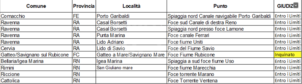 Gli altri dieci punti campionati risultati tutti entro i limiti di legge sono: spiaggia nord Canale di Porto Garibaldi a Comacchio (Ferrara); nel comune di Ravenna la foce sud canale di destra Reno, spiaggia nord Foce Lamone, Foce canale Ferrari e Foce fiumi Uniti; nel comune di Cervia la foce del fiume Savio; spiaggia a sud foce fiume Uso nel comune di Bellaria-Igea Marina; foce fiume Marecchia a Rimini; foce torrente Marano a Riccione e la foce del torrente Ventena a Cattolica.