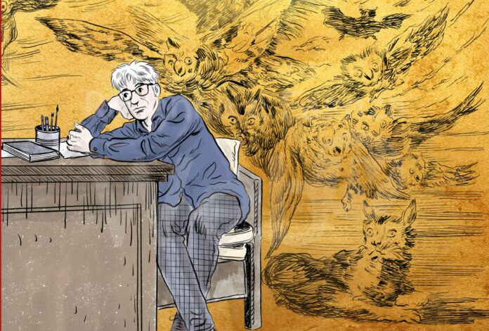 Otto Gabos ha deciso di adottare l’autofiction e ha raccontato senza filtri il suo incontro con Goya: dalla lettura e la ricerca attraverso saggi e cataloghi all’immersione totale che lo ha portato a ricreare condizioni di lavoro che rispecchiassero quelle di Goya, come la simulazione di sordità; dai laboratori di grafica d’arte dell’Accademia di Belle Arti in cui ha studiato, per capire e infine realizzare un’acquaforte ispirata, molto vagamente, ai Capricci, fino alla visita di Madrid e dei luoghi di Goya, disegnando un carnet di viaggio. E infine, la frequentazione del sogno e dell’incubo, temi cari a Otto Gabos e trait d’union con l’opera di Goya.