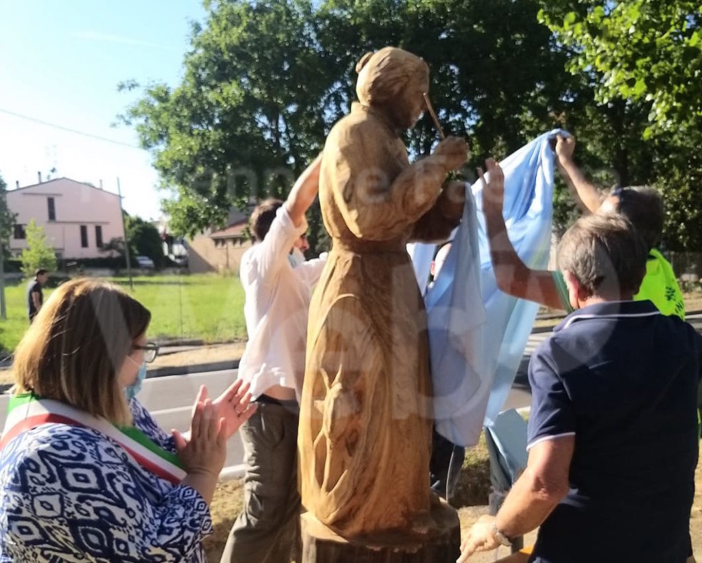 A concludere l’intensa giornata, l’inaugurazione della scultura lignea realizzata da Giovanni Liverani e raffigurante Maddalena Venturi (1860-1935), ricavata da un grosso ceppo residuo dopo la sostituzione di alcune alberature. Importante figura femminile che si intreccia alla storia di Granarolo, particolarmente noto in tutta la Romagna per la tradizionale produzione dei plaustri, o carri agricoli, Maddalena era definita come una donna ‘timida, schiva, quasi analfabeta’. Tuttavia, una volta presi in mano colori e pennelli pennelli si trasformava in una raffinatissima artista che decorava i carri con fiori dai vivacissimi colori e con raffigurazioni del San Giorgio e della Madonna delle Grazie. Diversi carri decorati da Maddalena Venturi sono ancora esistenti e oggetto di spasmodica ricerca da parte di amatori e collezionisti.
