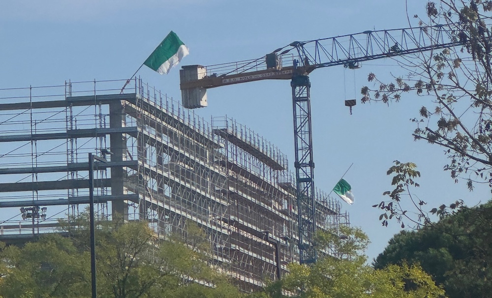Le due bandiere, probabilmente issate con spirito di entusiasmo operaio ma zero supervisione, oggi appaiono ridotte a brandelli, logore, scolorite e si agitano penosamente sopra un cantiere che, già di per sé brilla più per i ritardi cronici che per la puntualità e in cui non c’è nulla da festeggiare. Un’immagine perfetta, a pensarci bene: bandiere a pezzi su un progetto a pezzi, una specie di meme edilizio in tempo reale.