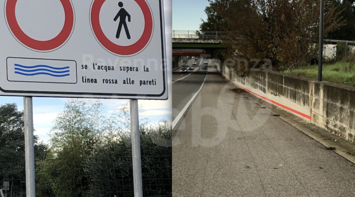 In Viale Europa, all’ingresso del sottopasso che passa sotto la via dei Poggi, nel tratto fra le rotonde Gran Bretagna e Germania campeggia un cartello (la cui foto è allegata alla presente) che vieta giustamente il transito a veicoli e pedoni in caso di allagamento, nel caso in cui “l’acqua superi la linea rossa alle pareti”.