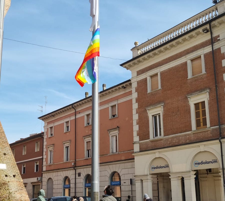 La bandiera della pace sventola in piazza dei Martiri a Lugo. Il Comune ha deciso di esporre la bandiera con i colori dell’arcobaleno nel giorno in cui l’Ucraina è stata invasa e bombardata dalla Russia. Un modo per ribadire che la pace è l’unica via percorribile e manifestare vicinanza alla comunità ucraina presente sul territorio lughese.