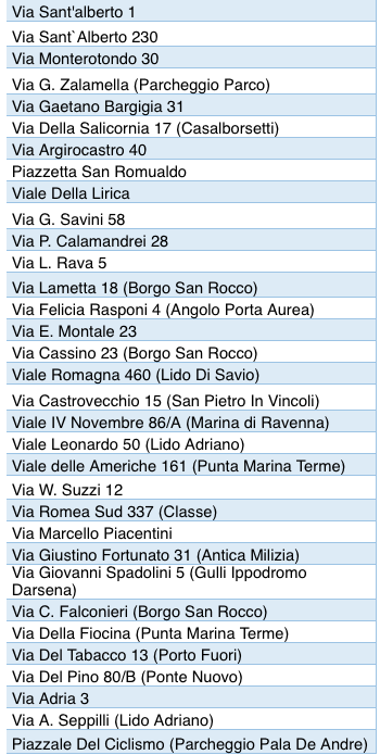 Di seguito gli indirizzi delle 33 nuove postazioni appena installate: