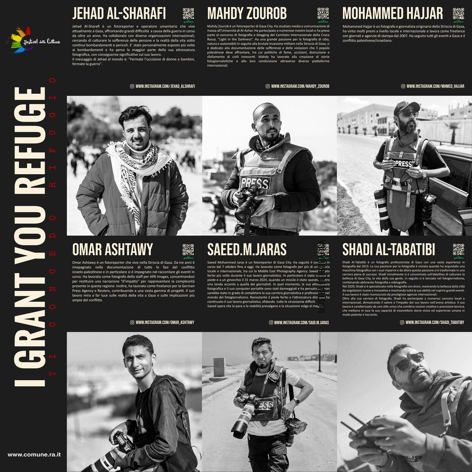 Il Festival delle Culture 2025, dal 15 aprile al 30 giugno, dedica un focus sulle condizioni di vita della popolazione civile palestinese a Gaza attraverso la mostra fotografica collettiva e diffusa “I Grant You Refuge” (Vi concedo rifugio) di sei fotografi palestinesi: Shadi Al-Tabatibi, Mahdy Zourob, Mohammed Hajjar, Saeed Mohammed Jaras, Omar Naaman Ashtiwi e Jehad Al-Sharafi.