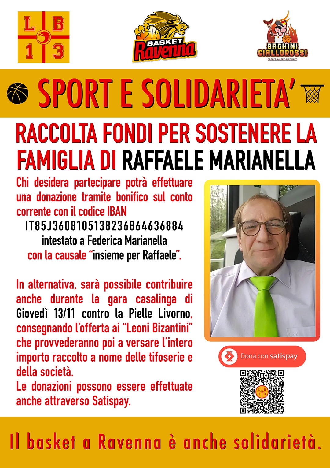 Sarà inoltre possibile partecipare anche giovedì 13 novembre, in occasione della partita casalinga dell’OraSì Ravenna contro la Pielle Livorno, consegnando la propria offerta al banchetto dei Leoni Bizantini (anche tramite Satispay). L’intero importo raccolto sarà devoluto alla famiglia Marianella a nome delle tifoserie e della società.