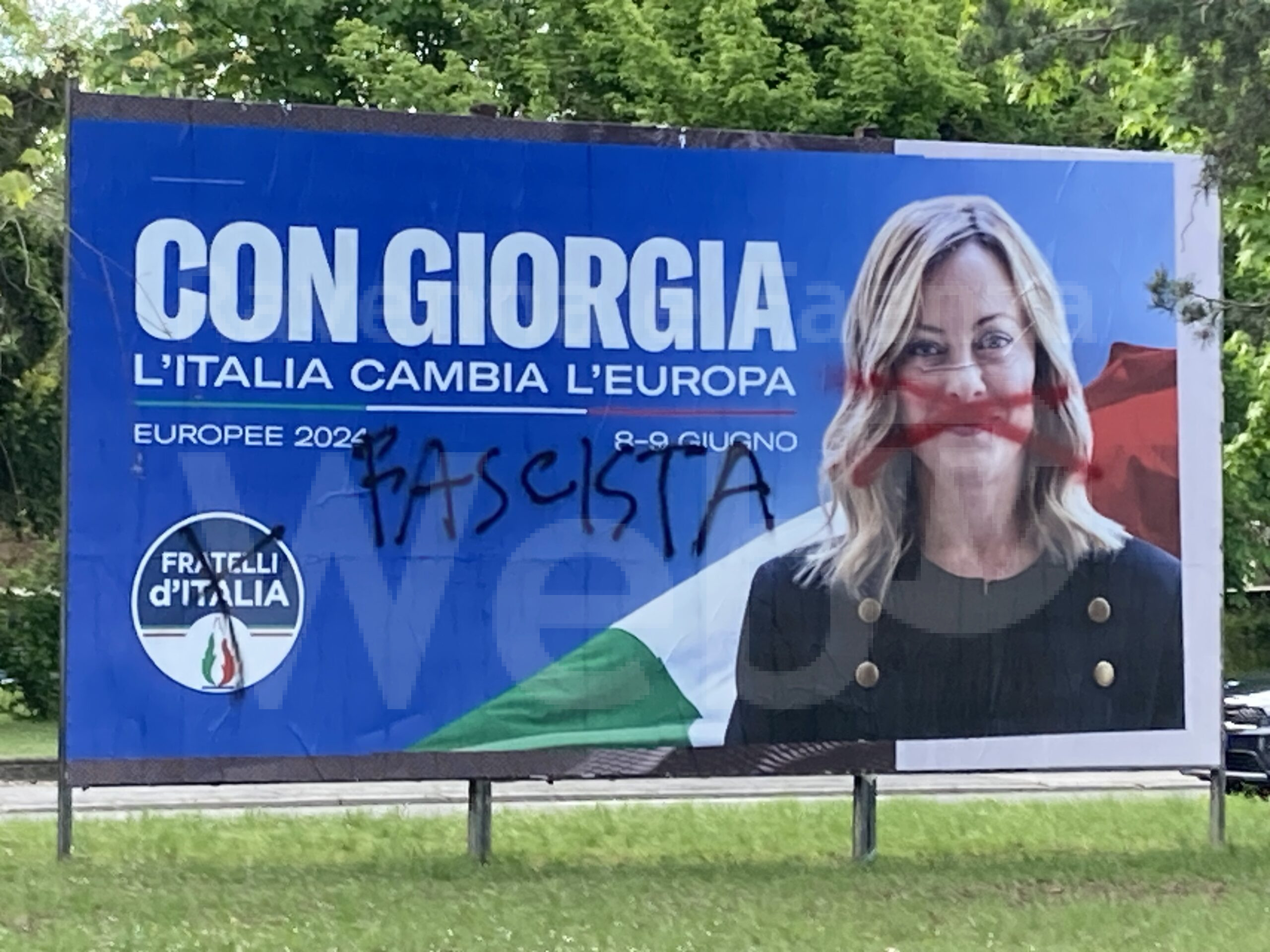 Mentre si celebrava il 25 Aprile ignoti hanno imbrattato i manifesti elettorali per le elezioni europee di Giorgia Meloni e di Matteo Salvini in viale Randi e in Circonvallazione al Molino.