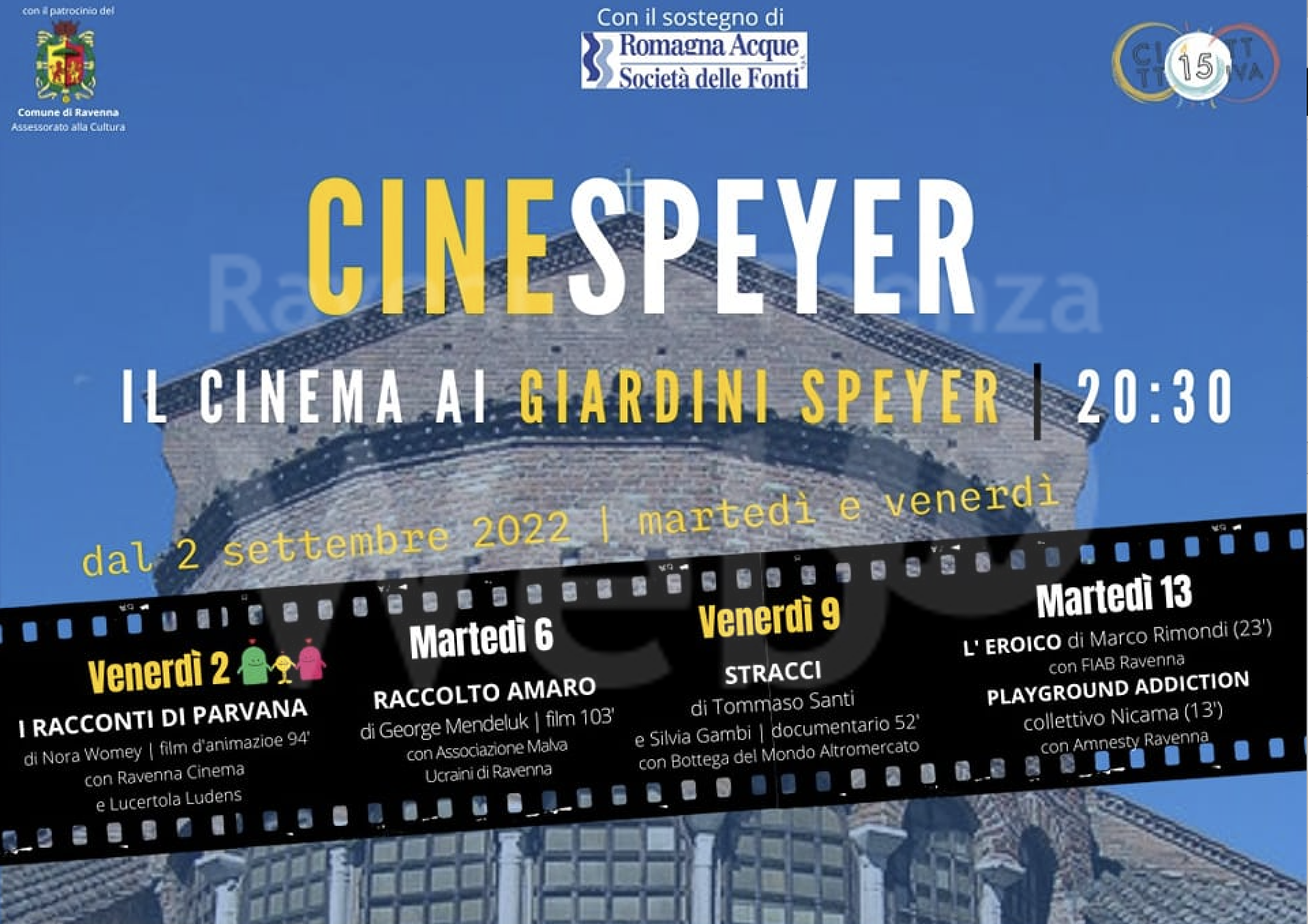 Sarà il cinema ad animare gli ultimi martedì e venerdì d’estate ai Giardini Speyer. Citt@ttiva ha infatti presentato una nuova rassegna cinematografica che partirà venerdì 2 settembre, realizzata con il sostegno di Romagna Acque e con il contributo di diverse associazioni. Non sarà allestita una vera e propria sala cinematografica, solo uno schermo. Il pubblico potrà sedersi per terra o rimanere in piedi, portarsi da casa sedie, tappeti o cuscini. Non ci sarà un biglietto d’ingresso, si potrà assistere alle proiezioni anche di passaggio oppure mentre i bambini giocano nel parco.