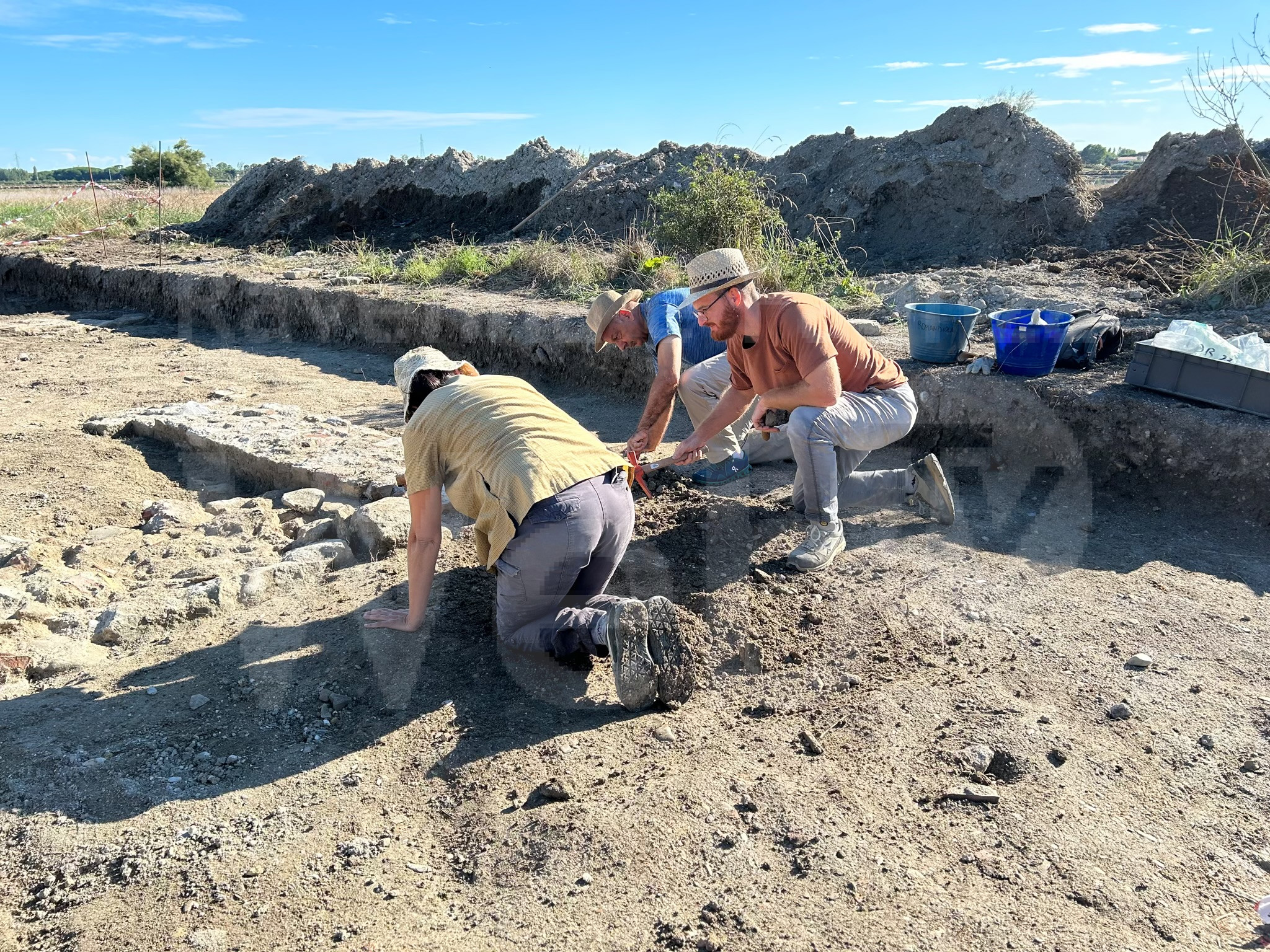 Nel 2023, anche a causa delle condizioni della salina a seguito dell’alluvione di maggio, l’indagine si è spostata al Prato della Rosa. Qui sono stati rinvenuti i resti di un imponente edificio di culto che pare risalire al V sec. Si tratta di una interessante scoperta che ha riproposto il tema della presenza di Ficocle e della frequentazione dell’area sull’isoletta più piccola delle saline.