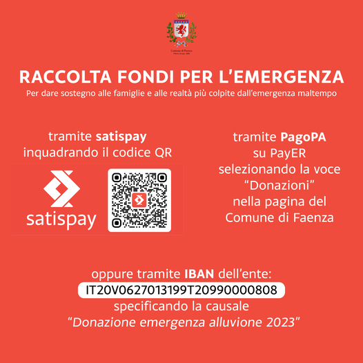 Il Comune di Faenza ha avviato una raccolta fondi “per l’emergenza alluvione nel territorio faentino, per dare sostegno alle famiglie e alle realtà più colpite. Si tratta di una raccolta fondi per aiutare i concittadini ad affrontare questa prima fase di emergenza, in risposta alla generosità di tanti che ci hanno già chiesto come poter aiutare”.
