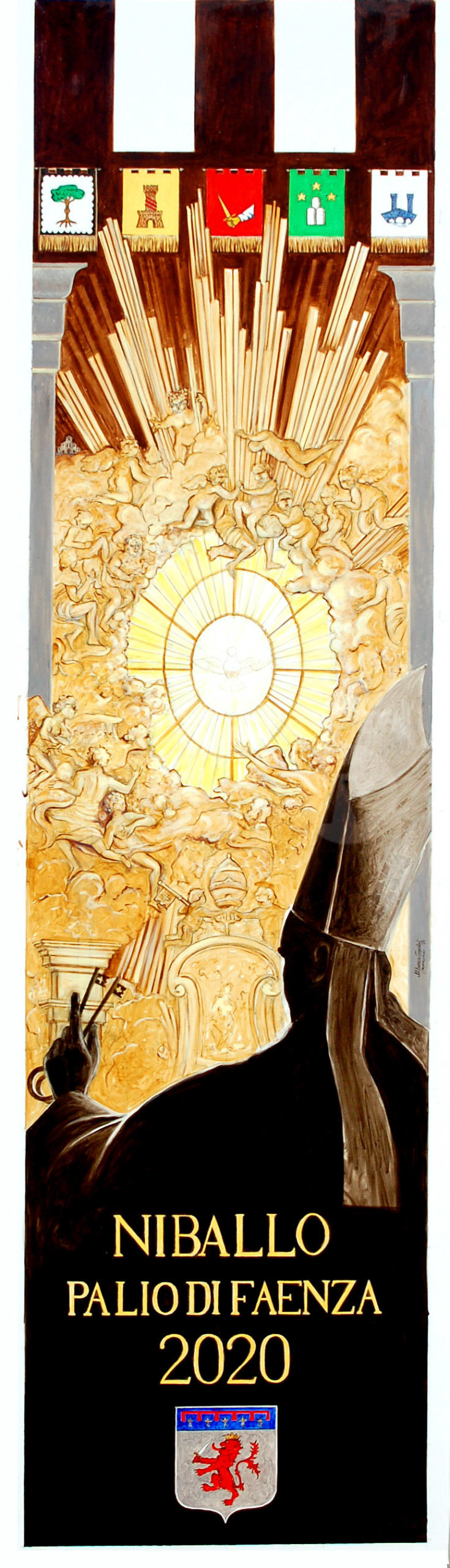 Ho assistito da esterno all’iter che ha portato a questa scelta sofferta e, come è naturale che sia, in questa situazione inedita, mi sono reso disponibile a dare l’unico contributo a mia disposizione verso la città di Faenza, quello cioè di modificare e adeguare il drappo all’anno 2021, in modo che possa essere utilizzato per la prossima edizione del Palio, col desiderio, anch’io, di poterlo vedere nel suo contesto naturale per cui è stato studiato: quello di premio per il Rione vincitore della 64esima edizione del Niballo Palio di Faenza.”