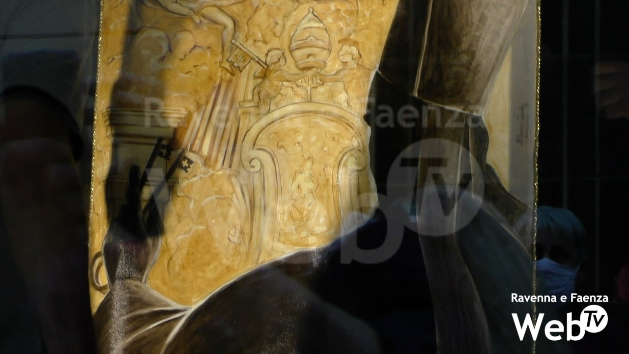 “Sovente San Pietro è stato rappresentato nella sua veste di uomo: spesso un pescatore, una figura umile, con i suoi conflitti interiori o le sue debolezze”, spiega l’artista. “Io invece, in questo drappo realizzato per il Palio di Faenza, ho voluto dare un’interpretazione meno usuale della figura di Pietro, esaltandone il carattere combattivo e l’importanza che questo è stato chiamato ad avere con il suo ruolo di fondatore della Chiesa. Per questo l’ho voluto rappresentare in forma allegorica in cui l’apostolo non veste più i panni di uomo umile, ma indossa la mozzetta e porta sul capo la mitra. Queste vesti vogliono simboleggiare il suo ruolo di primo vescovo di Roma e quindi primo Papa; nella mano sinistra tiene le chiavi, anziché impugnare il pastorale e questo, impone al corpo, un movimento in avanti sottolineando il carattere combattivo del santo, che è posto in primo piano e in controluce”.