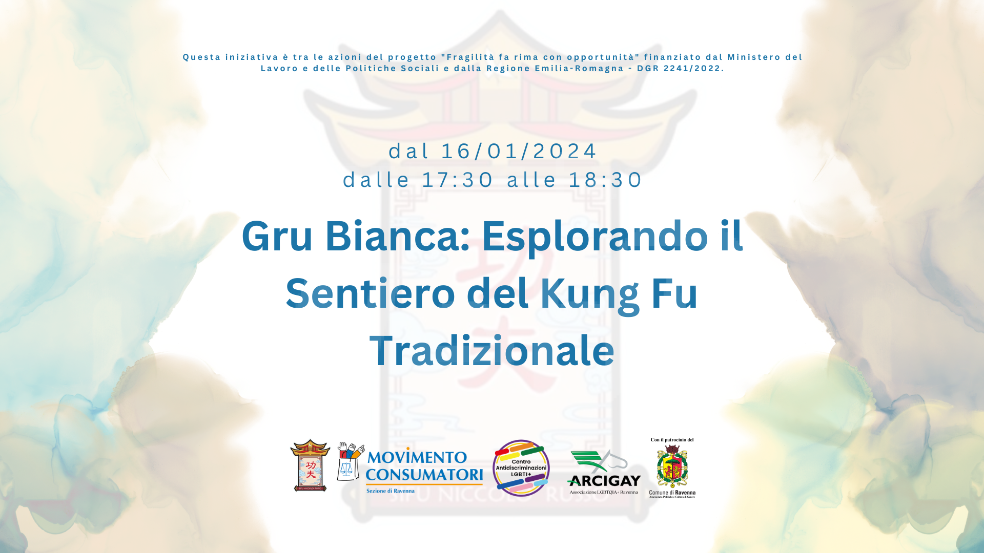 Si chiama “Gru Bianca: esplorando il sentiero del Kung Fu tradizionale” ed è il laboratorio gratuito organizzato in collaborazione con Orientamente e con il Centro Antidiscriminazioni LGBTI+ di Ravenna nell’ambito del progetto “Fragilità fa rima con opportunità” finanziato dal Ministero del Lavoro e delle Politiche Sociali e dalla Regione Emilia-Romagna – DGR 2241/2022.
