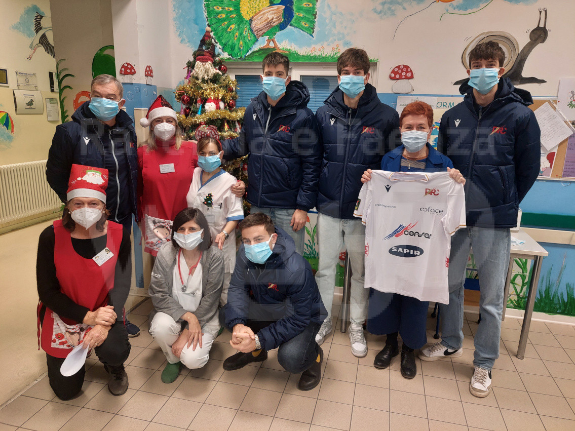 Continuando la collaborazione con A.G.E.B.O. (l’associazione dei genitori dei bambini ospedalizzati) di Ravenna e con l’unità Operativa di pediatria dell’ospedale Santa Maria delle Croci, una rappresentanza della Consar Ravenna, formazione che milita nel campionato di A2 maschile di pallavolo, con l’avvicinarsi del Natale anche quest’anno ha fatto visita al reparto. La delegazione della squadra, composta dal coach Marco Bonitta, dal capitano Riccardo Goi, da Filippo Bartolucci, Mattia Orioli e Felipe Benavidez, ha portato in dono una divisa ufficiale, che si aggiunge ad un altro regalo che verrà consegnato nei prossimi giorni: due divanetti a tre posti realizzati dalla ditta Borgione, di colore verde, a norma per i nidi e le scuole d’infanzia. Saranno collocati nella sala d’attesa del Pronto soccorso pediatrico. La donazione è avvenuta ieri mattina, alla presenza di una delegazione di volontarie di A.G.E.B.O., presidente Fongoli in testa, e di rappresentanti dello staff di pediatria.