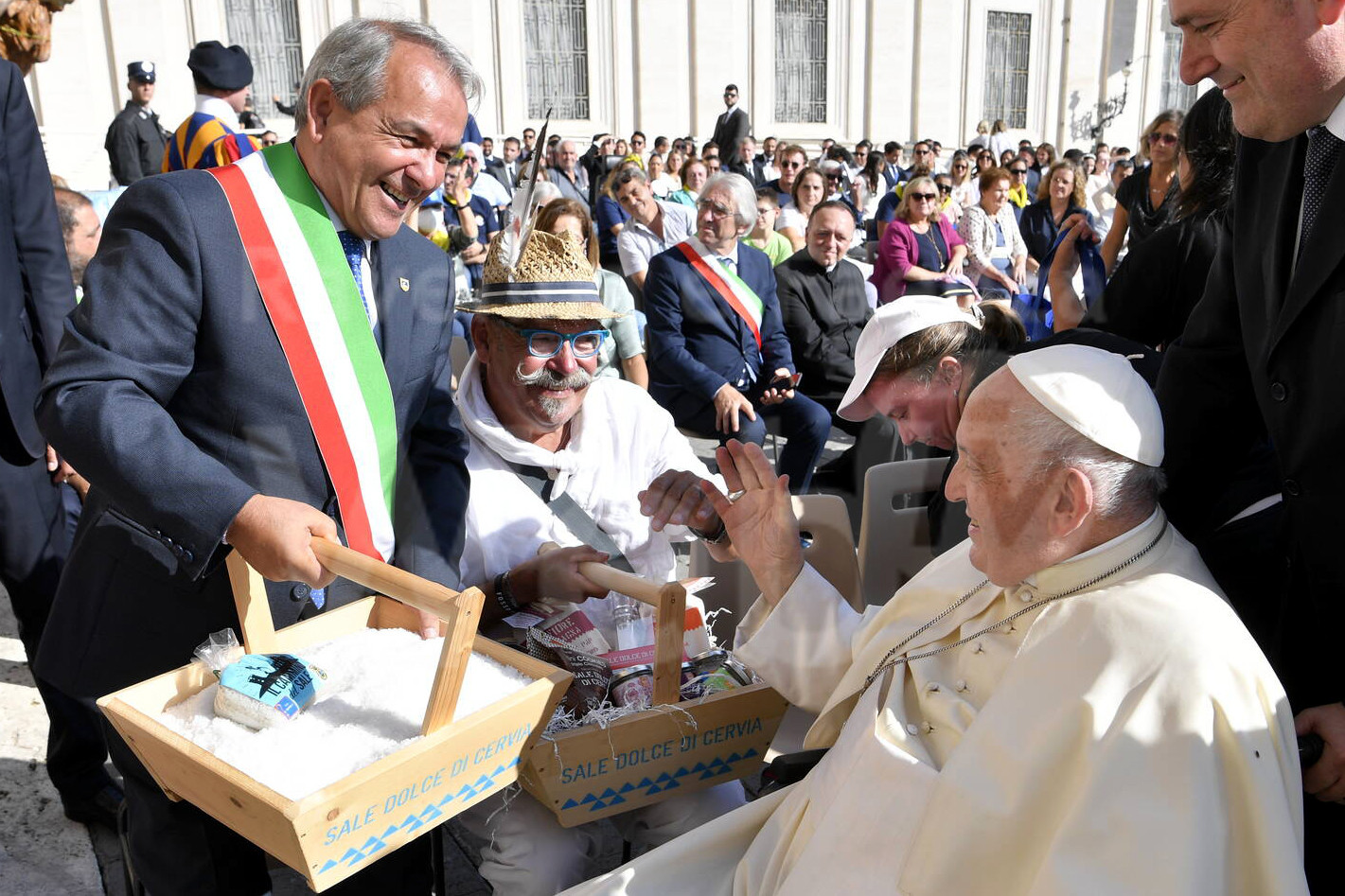 L’11 ottobre il pregiato Sale di Cervia, come da tradizione, è stato consegnato a papa Francesco, in occasione dell’udienza plenaria del mercoledì. Il Pontefice, che ha ricordato la sua amicizia con il cervese don Mario Marini, ha ricevuto il prezioso dono dal presidente del Consiglio comunale Gianni Grandu e da rappresentanti del Gruppo civiltà Salinara, giunti in Vaticano come pellegrini delCammino del sale. Presente anche il vicesindaco Gabriele Armuzzi e, naturalmente, i camminatori del sale.