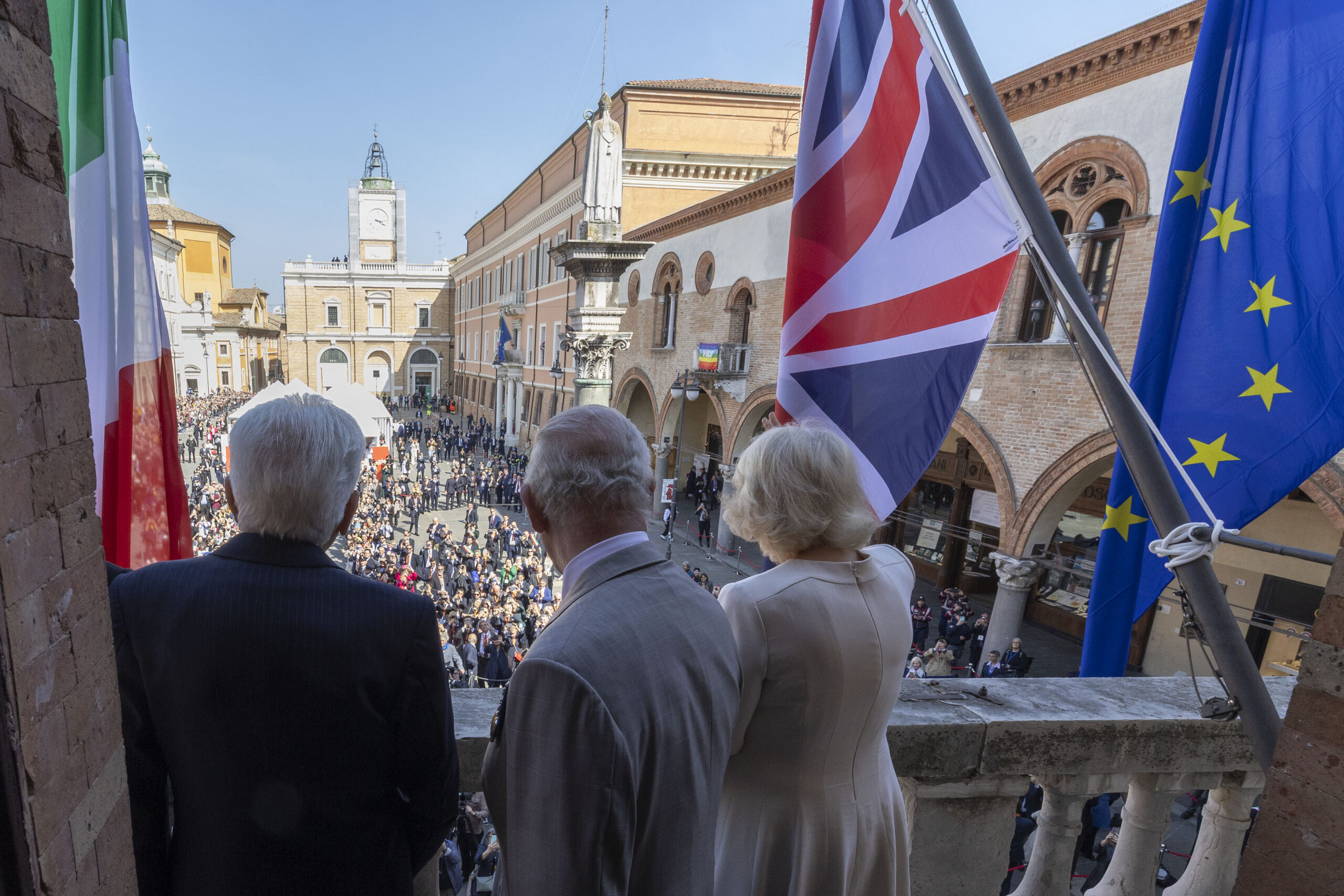 Dopo essere stati accolti dal Presidente della Repubblica Sergio Mattarella in Piazza del Popolo e aver incontrato il consiglio comunale, Carlo e Camilla si sono affacciati dal balcone di Palazzo Merlato per salutare la folla.