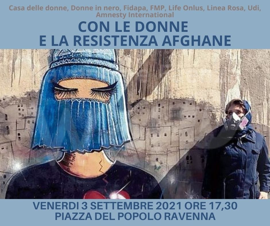 Venerdì 3 settembre dalle ore 17,30 Casa delle donne, Donne in Nero, Udi, Linea Rosa, FIDAPA, Femminile Maschile Plurale, Emergency Ravenna, Life Onlus, Amnesty Ravenna saranno in Piazza del Popolo a Ravenna per “dare voce e sostegno alle donne afghane e alla resistenza della società civile afghana laica e democratica”.