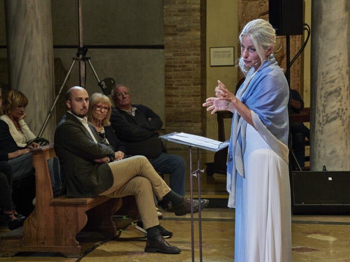 Il Paradiso di Dante è “un volo”, che cambia lo sguardo. Il viaggio di un’anima, che “ha una voce femminile”. Lucilla Giagnoni, attrice e sceneggiatrice lo spiega a Ravenna, nella basilica di San Francesco in occasione del Dantis Poetae Transitus, la commemorazione pubblica della morte del Sommo Poeta, venerdì 13 settembre a San Francesco. È un “corpo a corpo” quello di Lucilla con la Divina Commedia, l’esperienza “incarnata”, spiega all’inizio della sua riflessione su “Il Paradiso e Vergine Madre (Pd, XXXIII)”, che le ha “salvato la vita due volte: una dopo l’11 settembre 2001 e, 19 anni dopo, in pieno Covid. In entrambi i casi, racconta, Dante è stato un modo per “uscire dall’Inferno”, attraverso parole di bellezza.