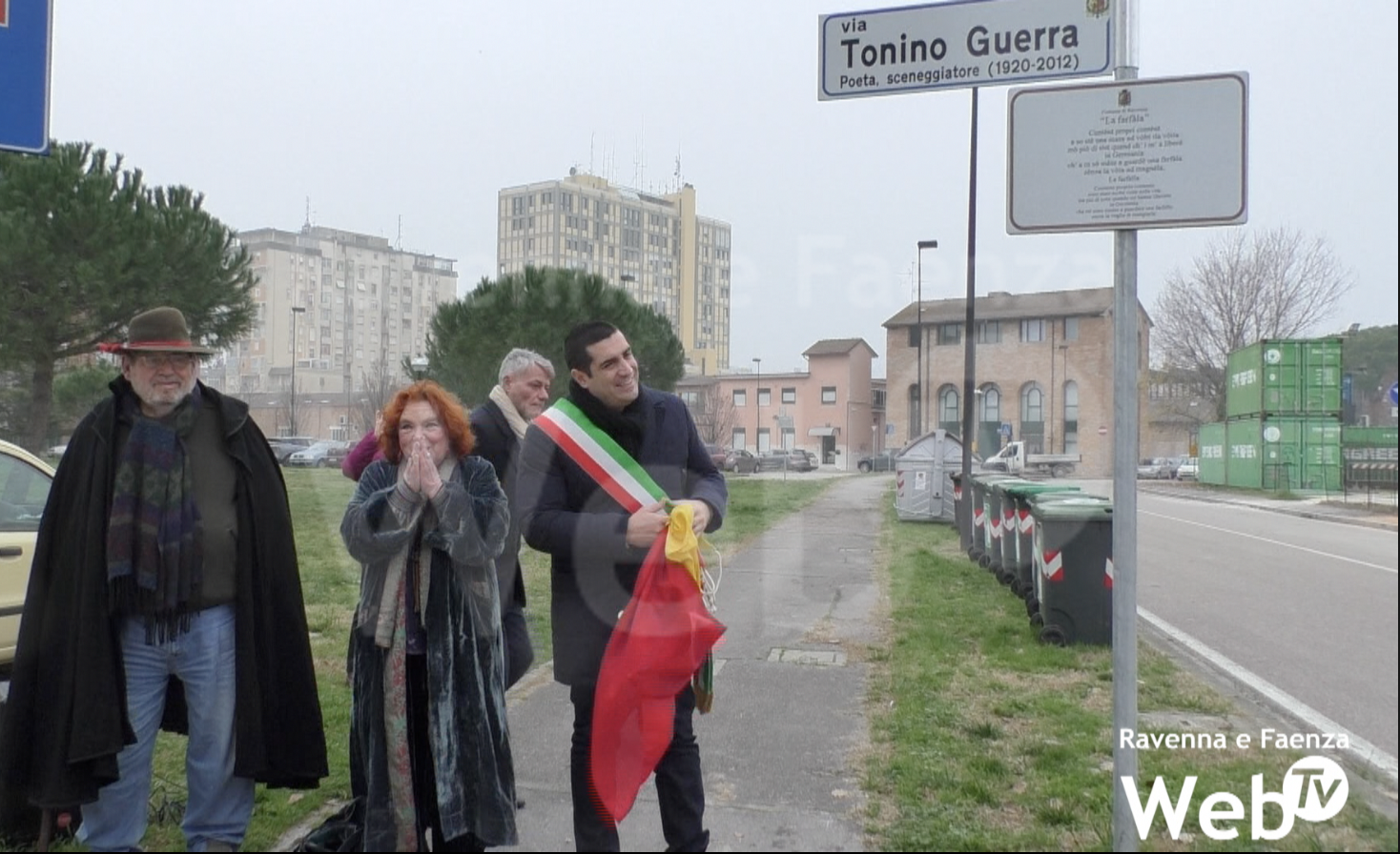 Intitolata a Tonino Guerra la strada che collega via dell’Almagià a viale Giovanni Spadolini. Al poeta, scrittore e sceneggiatore è stata dedicata la strada che costeggia il giardino denominato “Il deserto rosso”, in ricordo del film scritto insieme a Michelangelo Antonioni e girato a Ravenna. Un giardino che la famiglia ha intenzione di arricchire con varie iniziative.