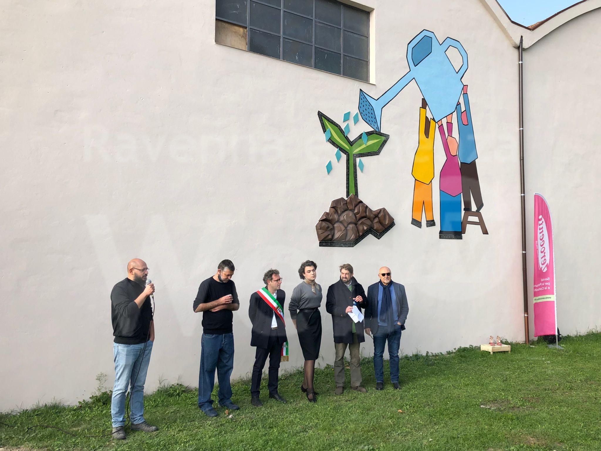 Il risultato finale è visibile in via Ravegnana 139, su una delle facciate del magazzino della cooperativa.