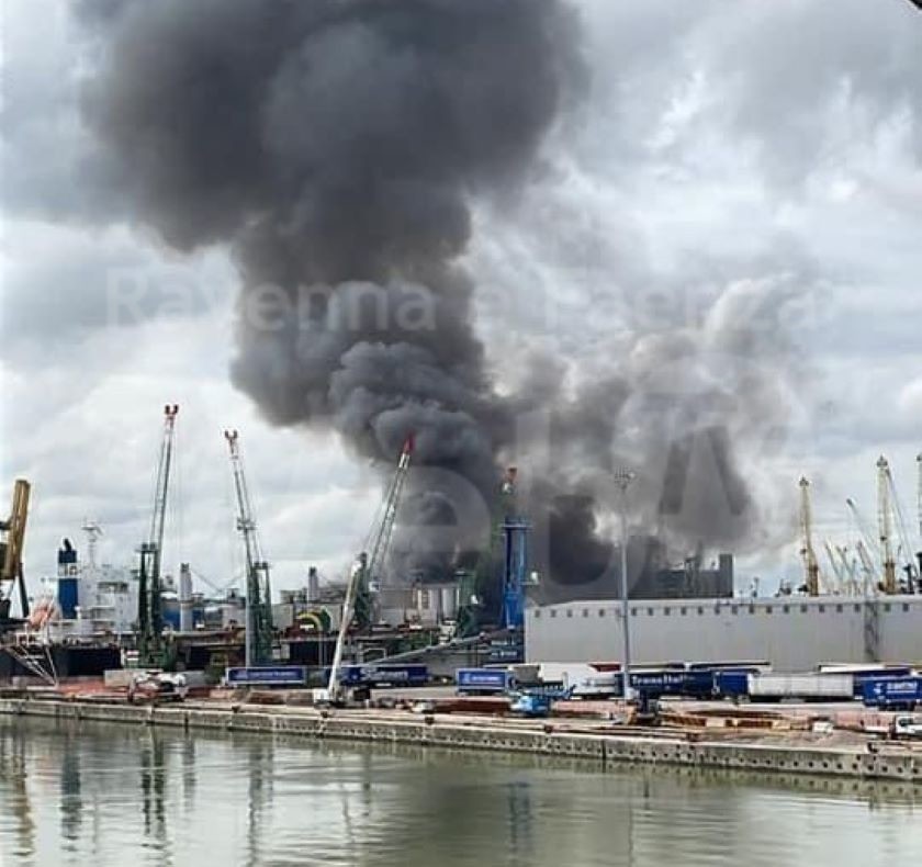 incendio al porto di Ravenna, poco dopo le ore 10 di questo giovedì, all’interno del terminal della Docks Cereali di via Classicana.