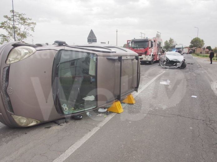L’autovettura Toyota. Yaris ha capottato rimanendo sul fianco sinistro in mezzo alla strada.