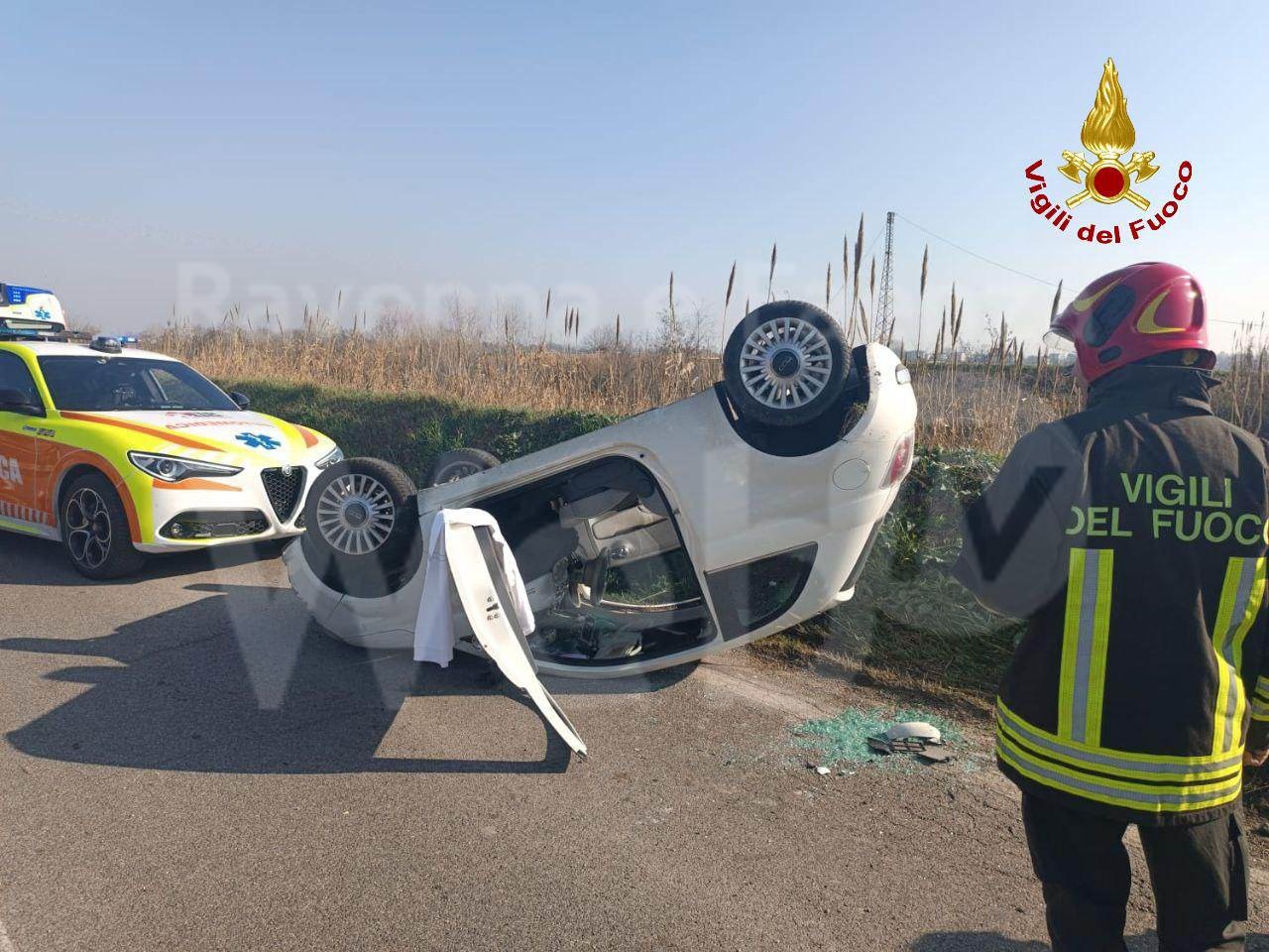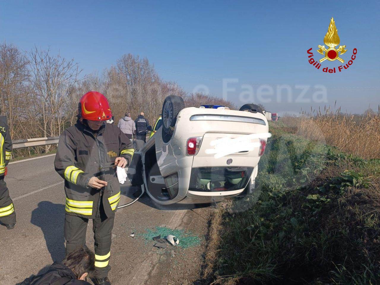 Incidente stradale al km 212 della Ravegnana. Una donna ha perso il controllo della vettura e si è ribaltata.