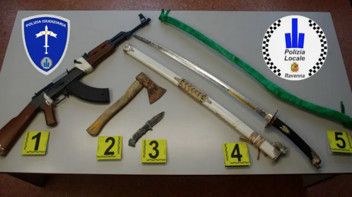 A bordo del veicoli, è stata ritrovata una katana con una lama di 73 cm, un coltello a serramanico, un bastone, la replica di un fucile d’assalto Ak-47, al quale era stato asportato il tappo rosso di legge, e un’ascia.