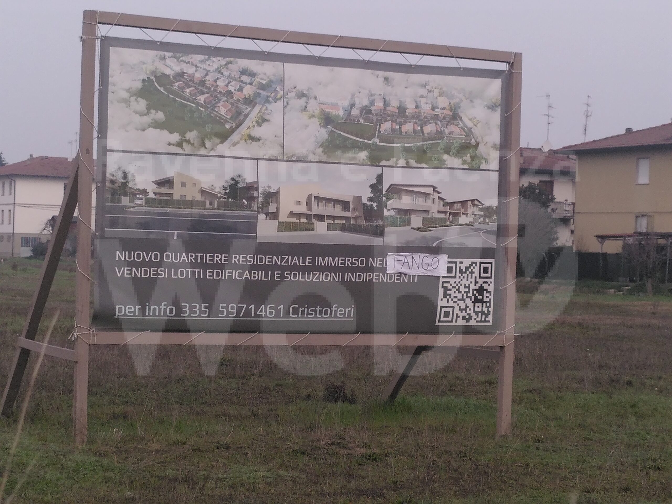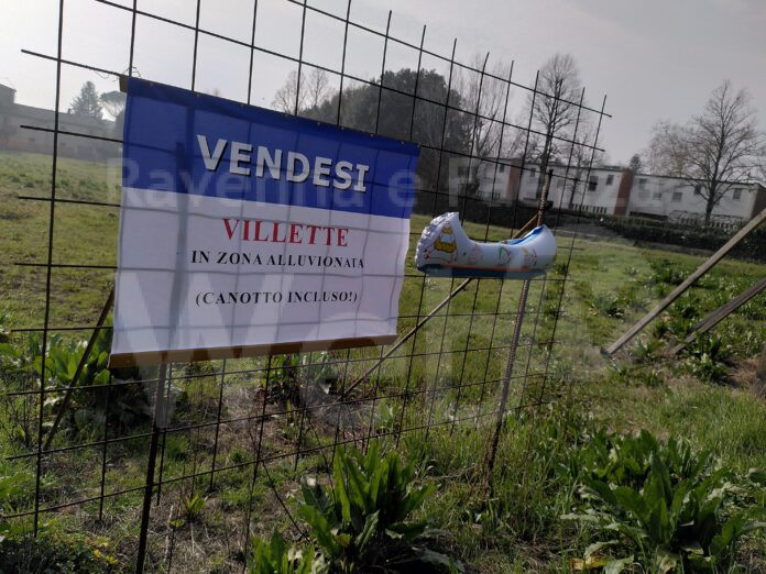 “Vendesi villette in zone alluvionate, canotto incluso/barca inclusa”. Nei telai destinati alla pubblicità, nell’orto della Ghilana è stato anche attaccato un canotto da bimbi mentre a Biancanigo una barchetta di carta con la scritta “stop cemento” e il logo di Extinction Rebellion. In entrambi i casi, sono state attaccate anche foto delle due zone ricoperte d’acqua durante l’alluvione di maggio scorso. A Biancanigo, dove i proponenti stanno già pubblicizzando il nuovo quartiere residenziale (nonostante non sia ancora stato approvato dal consiglio comunale l’accordo operativo), gli attivisti hanno coperto la parola ‘verde’ con ‘fango’ così che i passanti potevano leggere “nuovo quartiere residenziale immerso nel fango”.